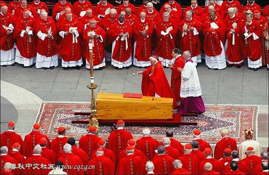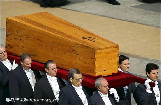 这样比照下来,教宗那只薄薄的未漆未画未雕的木匣子,即便勉强称之为棺材,也是一具白茬棺材——素棺。约翰·保罗二世,怎么说也是一位大人物,按照中国大陆的翻译,是“教皇”,应享九五之尊的。当然那译法饶有深意,事情做得不够正派。“教宗”“教皇”皆意译,其拉丁文原文是papa,即父亲之昵称“爸爸”,并无一丝“皇帝”的意思。大陆之外通常译为 “教宗”,祖宗、宗庙之宗,是取其头衔中“教会创始人圣彼得继承者”之意。即便如此,即便不是“教皇”而是“教宗”,不是“皇帝”而是“宗徒”,也不应该是一具素棺就抬出去埋了的。