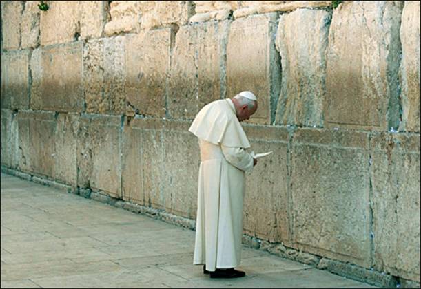 千年以来,基督教不断迫害犹太人,把耶稣之死归罪於整个犹太民族。2000年春,教宗历史性访问耶路撒冷,到犹太圣殿遗址前忏悔,把一封致歉信放进“哭墙”上巨石的缝隙,请求上帝宽恕基督徒对犹太人所犯下的一切罪行。他的手颤抖不止,如寒风中最后一片枯叶。