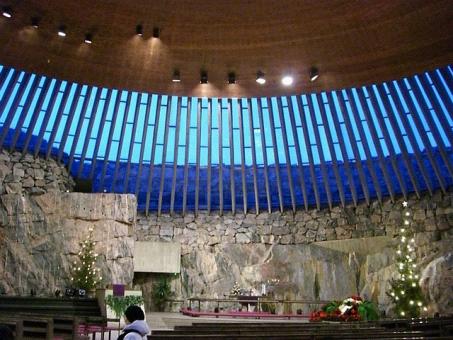 芬兰的岩石教堂。是把一个小山坡炸破后建成的,全部由石头、铜和木头组成,教堂内部的构造圆形的,顶部较为平坦,共有两层,“剧院式”的,由“舞台”和“观众席”组成,其中一侧悬挂着大型的管风琴。
